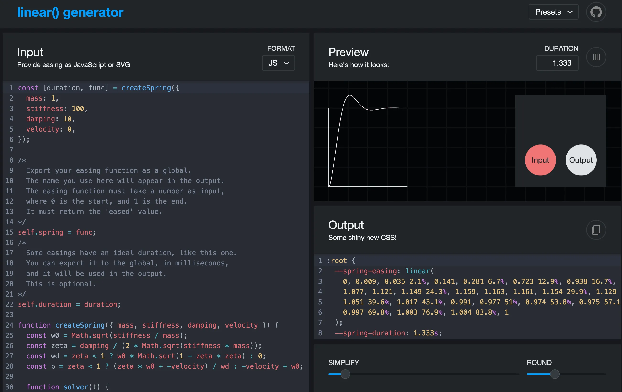 格式,从而在无需 JavaScript 的情况下实现复杂的动画效果,例如 bounce、spring、elastic 等。是从上文「使用 CSS linear()函数实现更逼真的物理动画效果 」中看到的工具。 -